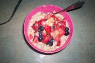 My breakfast is oatmeal with some raisins, strawberries, banana, blueberries and some fresh grapes added in. It is really good.